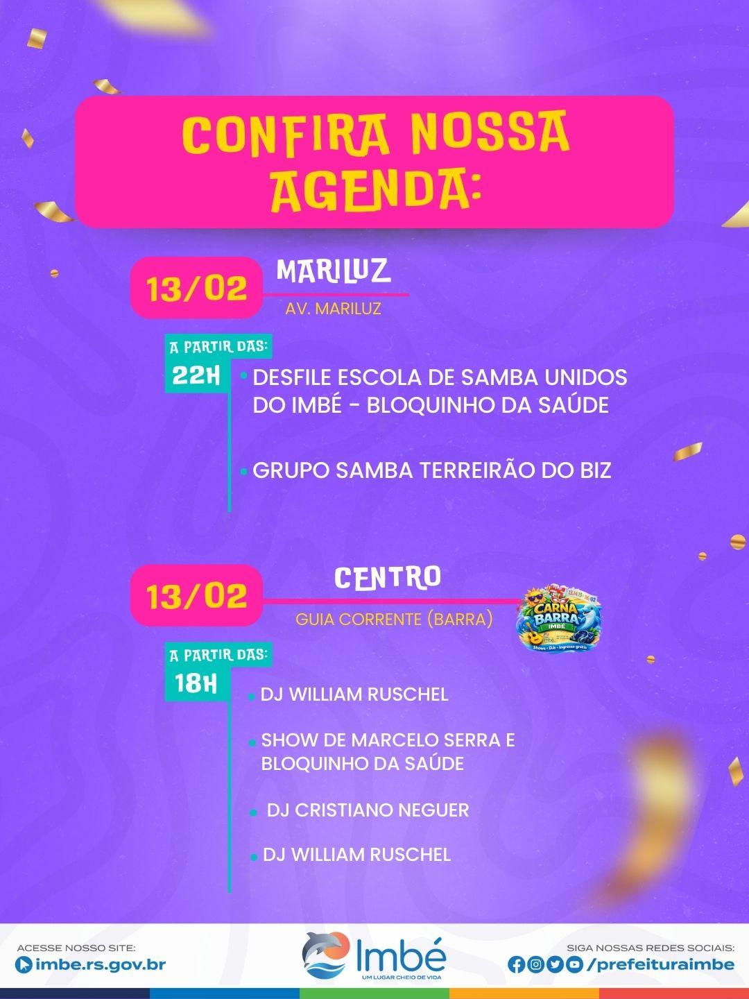 A primeira noite contará com apresentações na Avenida Mariluz, que iniciarão às 22h, com o desfile da Escola de Samba Unidos do Imbé, acompanhados do Bloquinho da Saúde, do Núcleo Municipal de Educação em Saúde Coletiva (NUMESC). Na sequência é a vez do Grupo Samba Terreirão do Biz assumir o controle da noite.