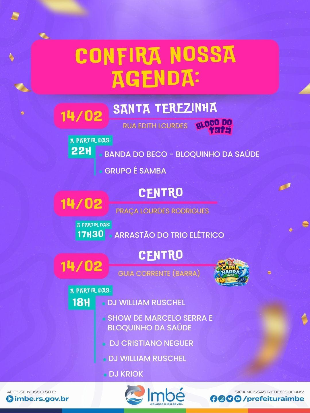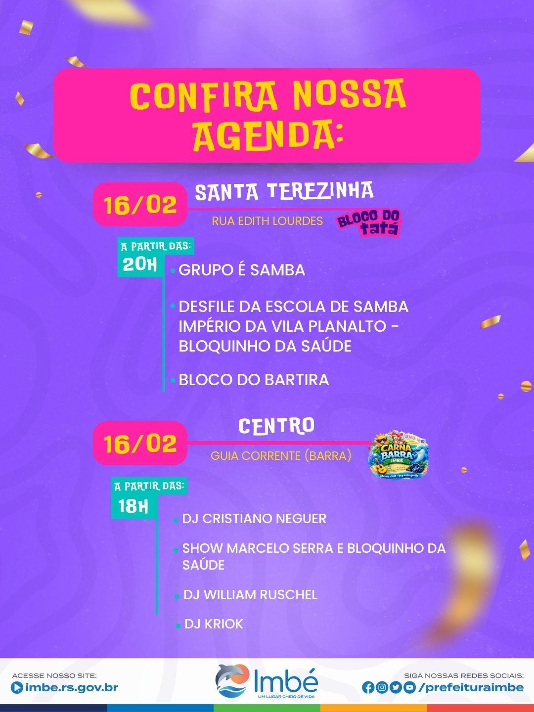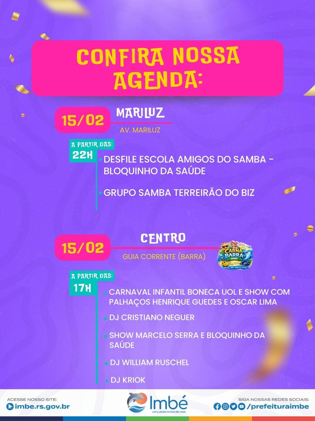 As noites de carnaval em Imbé serão embaladas por muita música e diversão, em diversos pontos da cidade. Ao longo de todo o feriadão de carnaval, palcos montados no Centro e nos balneários Mariluz e Santa Terezinha prometem muita festa e alegria. Os festejos iniciam nesta sexta-feira (13) e seguem até segunda-feira (16). A realização é da Prefeitura de Imbé, por meio da Secretaria Municipal de Turismo.