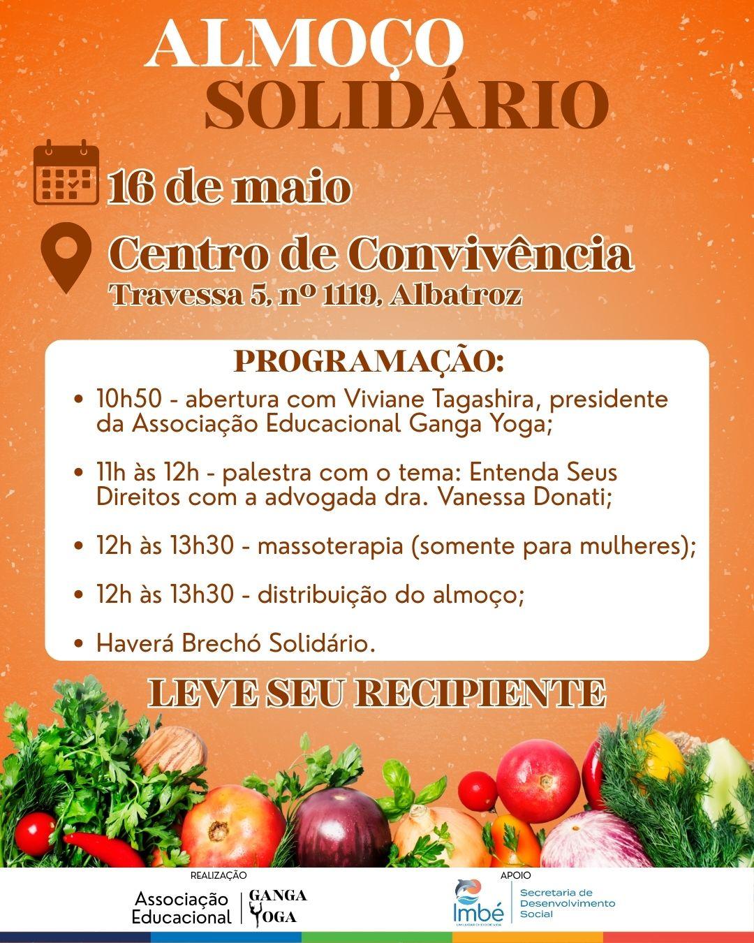 A Associação Educacional Ganga Yoga, com apoio da Prefeitura de Imbé, por meio da Secretaria Municipal de Desenvolvimento Social (SMDS), realizará no dia 16 de maio, um almoço solidário no Centro de Convivência, localizado na Travessa 5 nº 1119, no balneário Albatroz.