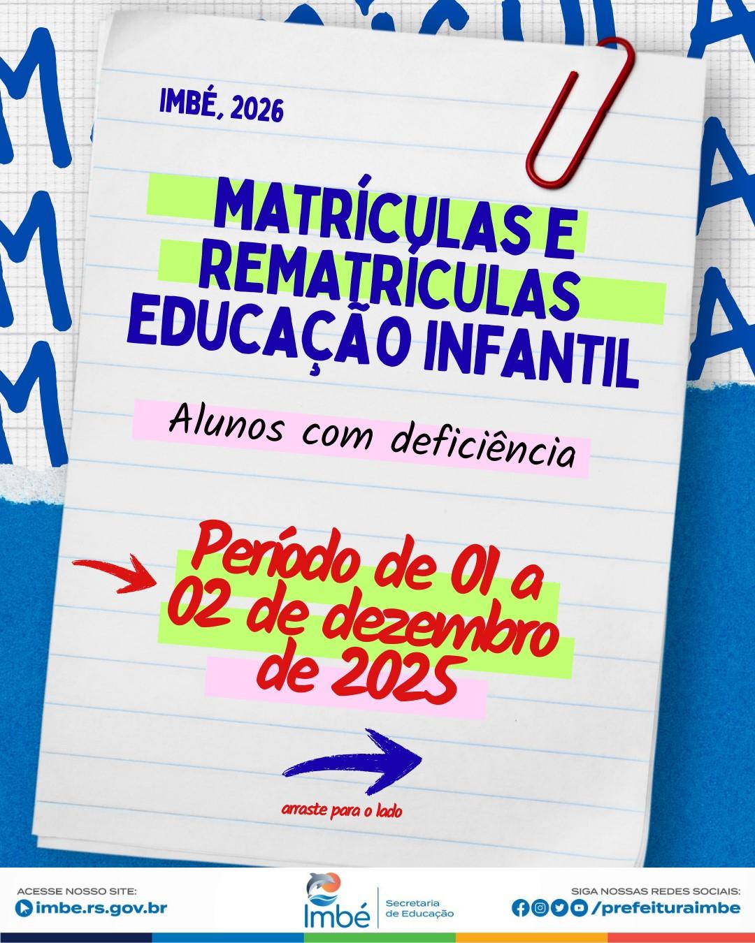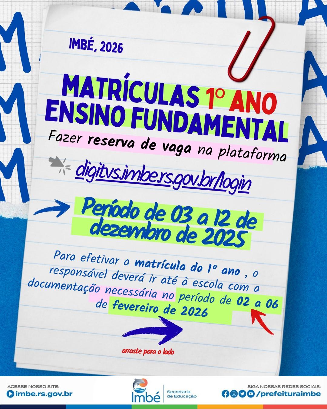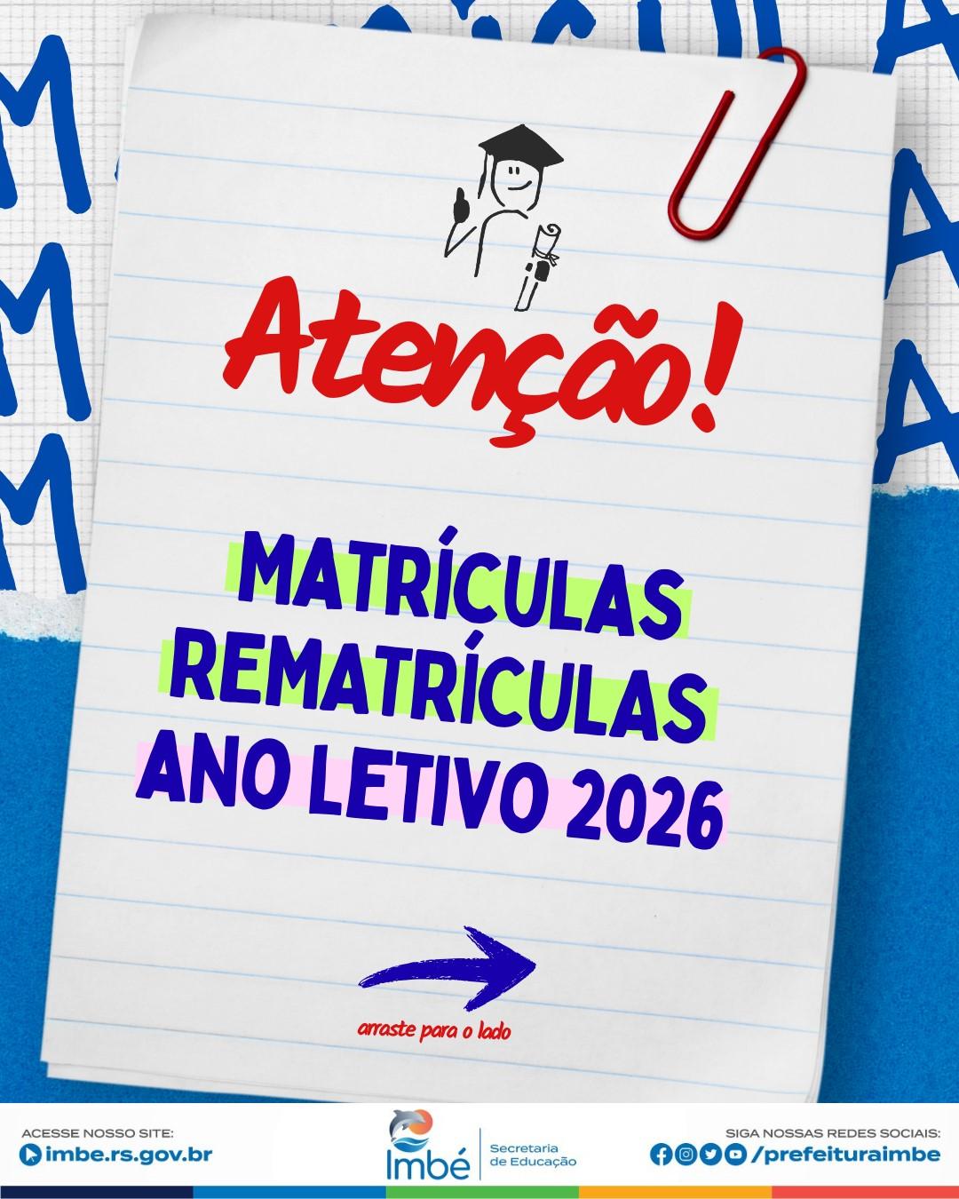 A Prefeitura de Imbé, por meio da Secretaria Municipal de Educação (SMED) publicou o calendário oficial de matrículas, rematrículas e transferências da rede municipal para o ano letivo de 2026. Os prazos abrangem estudantes da Educação Infantil e do Ensino Fundamental e contemplam alunos novos, estudantes com deficiência e crianças que farão a rematrícula para continuidade na rede municipal.