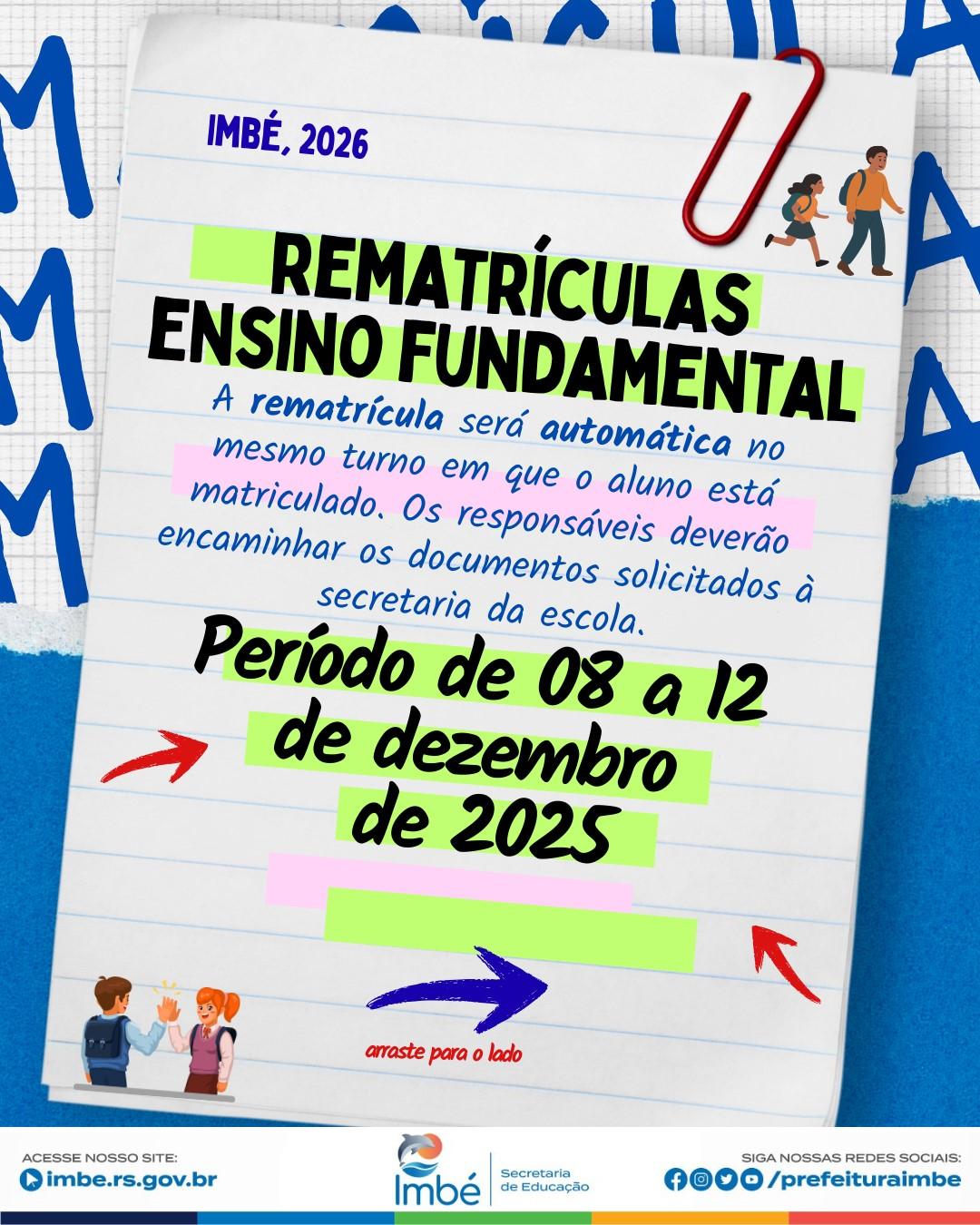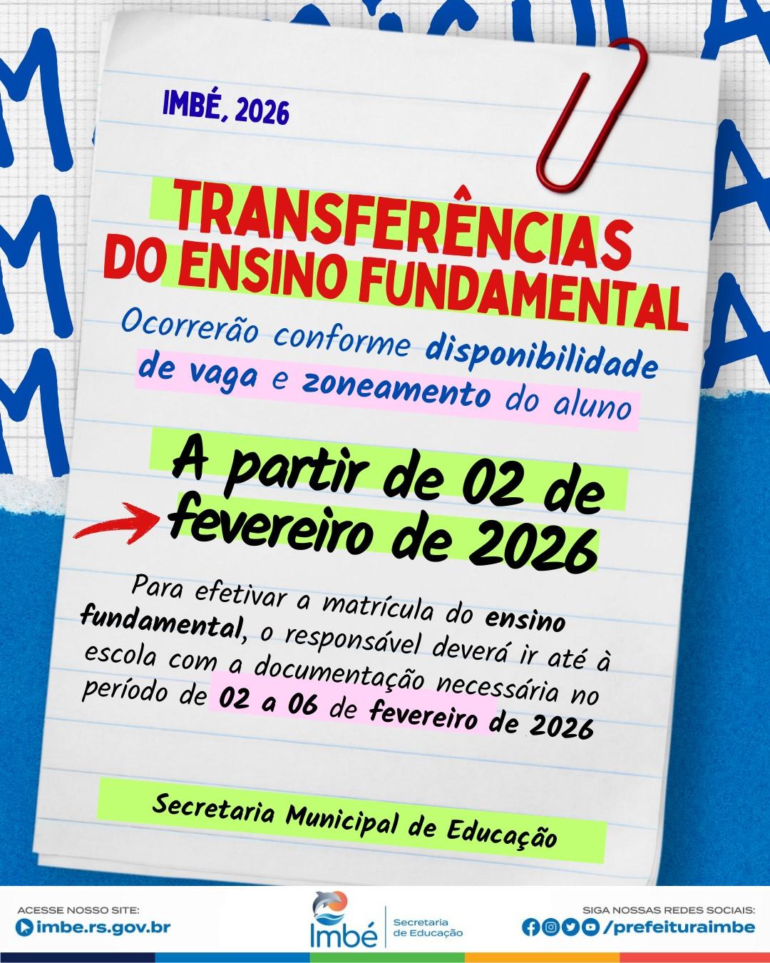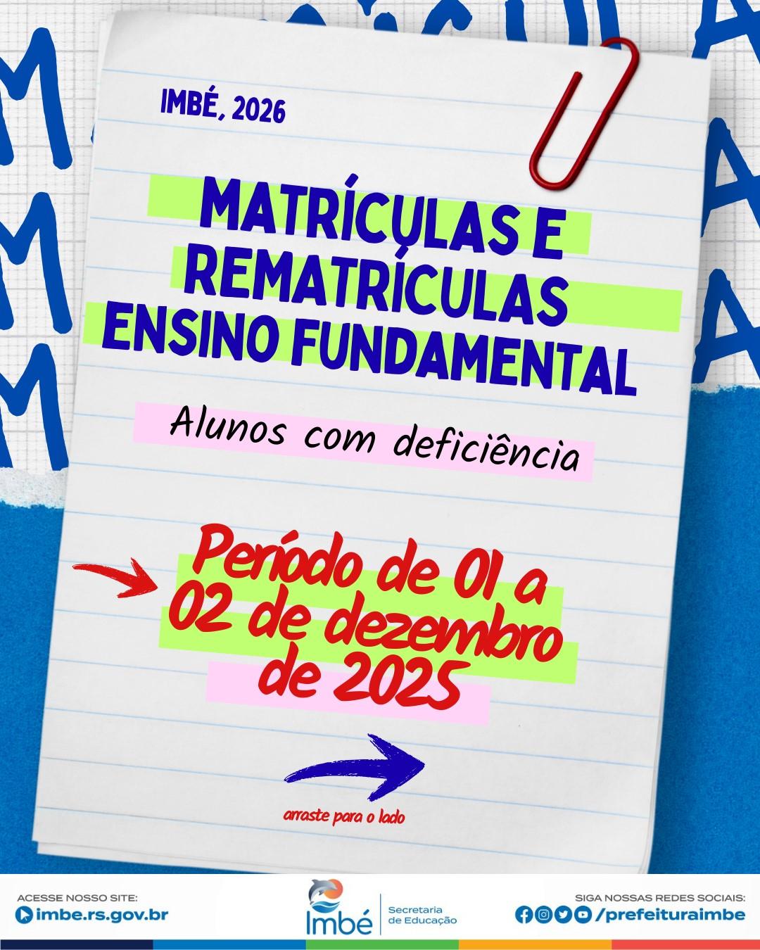 A Prefeitura de Imbé, por meio da Secretaria Municipal de Educação (SMED) publicou o calendário oficial de matrículas, rematrículas e transferências da rede municipal para o ano letivo de 2026. Os prazos abrangem estudantes da Educação Infantil e do Ensino Fundamental e contemplam alunos novos, estudantes com deficiência e crianças que farão a rematrícula para continuidade na rede municipal.