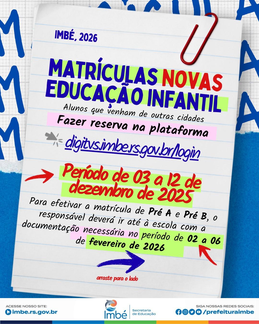 De acordo com a SMED, as matrículas de novas de crianças vindas de outros municípios deverão ser iniciadas com a reserva de vaga na plataforma digital digitv5.imbe.rs.gov.br/login, entre os dias 3 e 12 de dezembro de 2025. Após essa etapa, os responsáveis deverão comparecer presencialmente à escola, de 2 a 6 de fevereiro de 2026, para a efetivação da matrícula dos alunos do Pré A e Pré B.