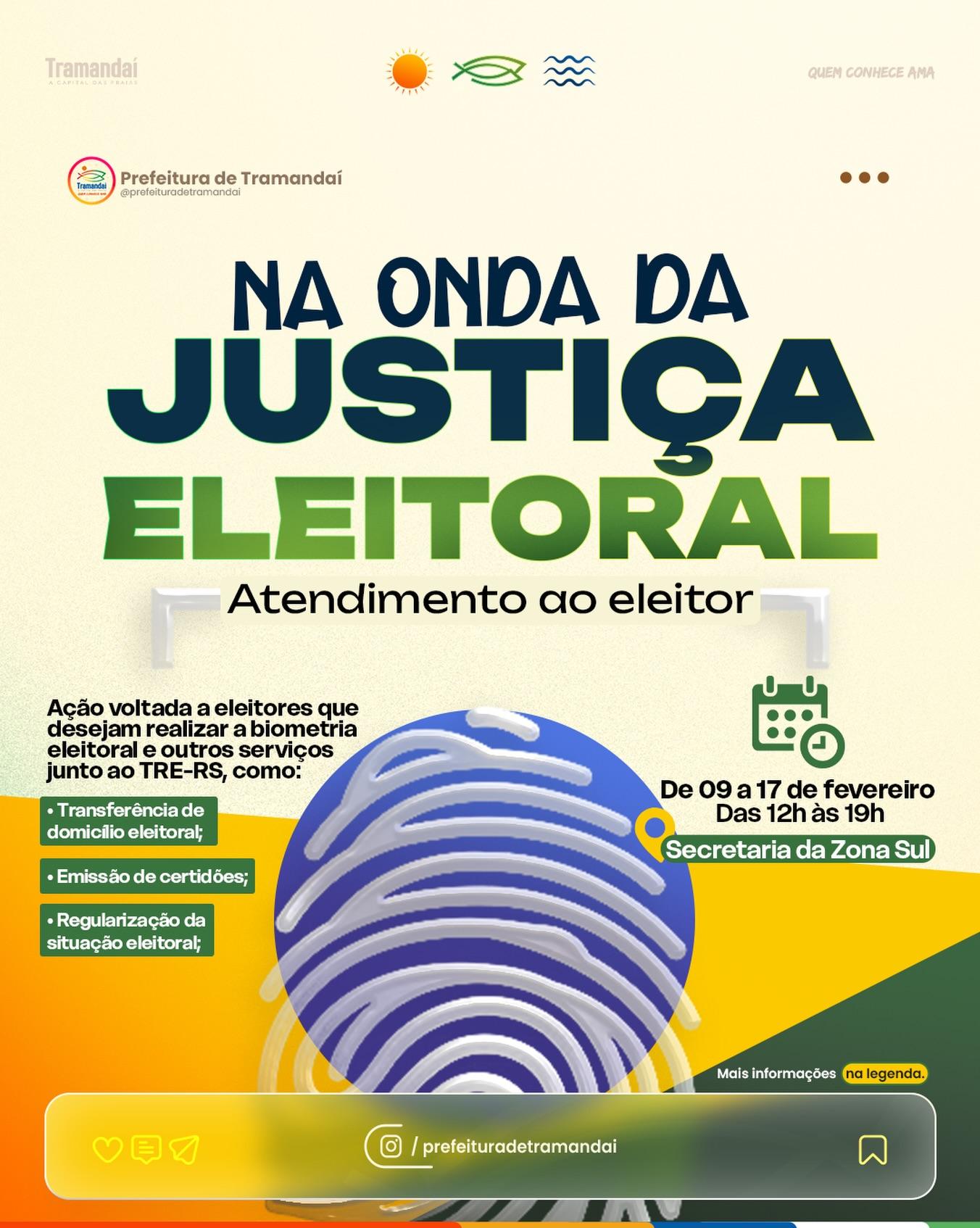 A Prefeitura de Tramandaí, em parceria com o TRE-RS, apoia a ação Na Onda da Justiça Eleitoral, que oferece atendimento direto à população para a realização de serviços eleitorais.