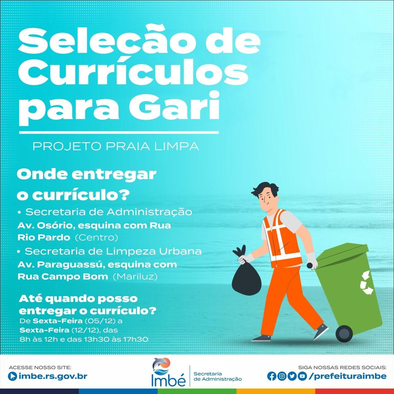 A Prefeitura Municipal de Imbé, através da Secretaria de Administração, iniciou a seleção de currículos para o cargo de gari dentro do Projeto Praia Limpa.