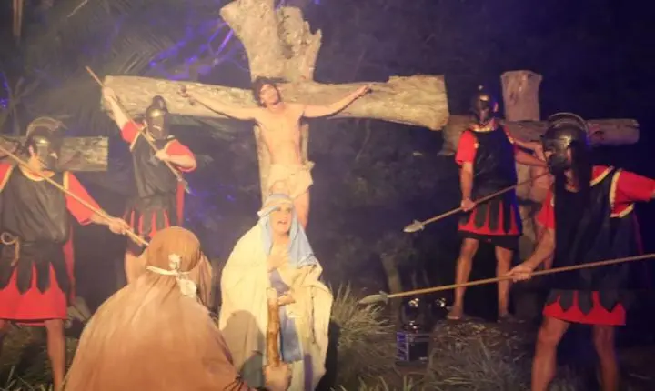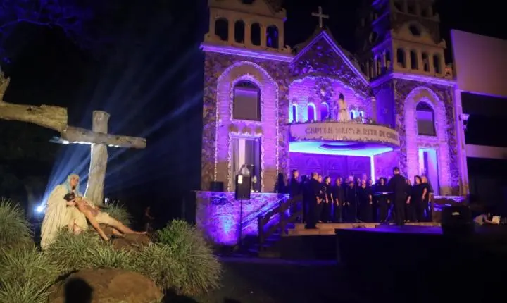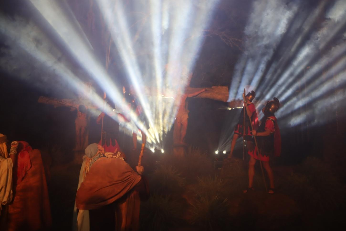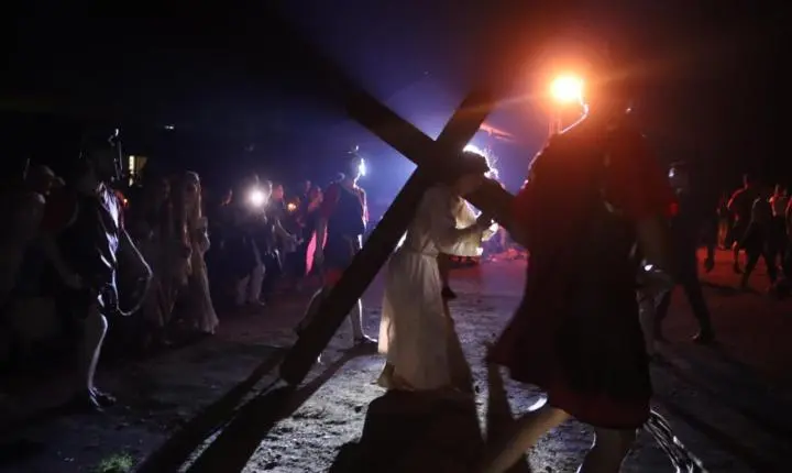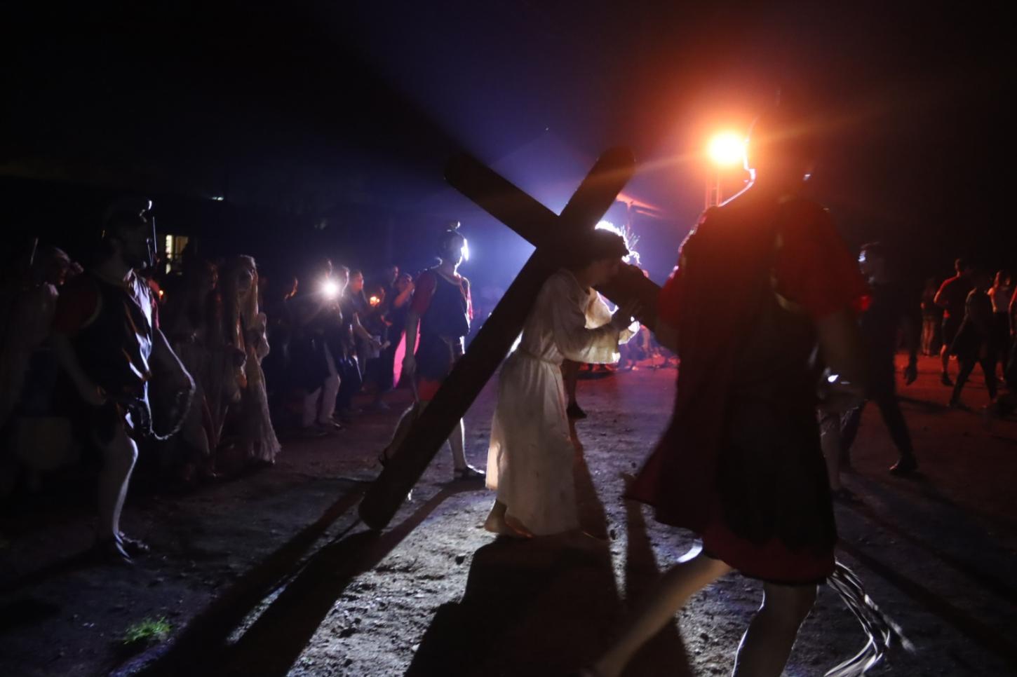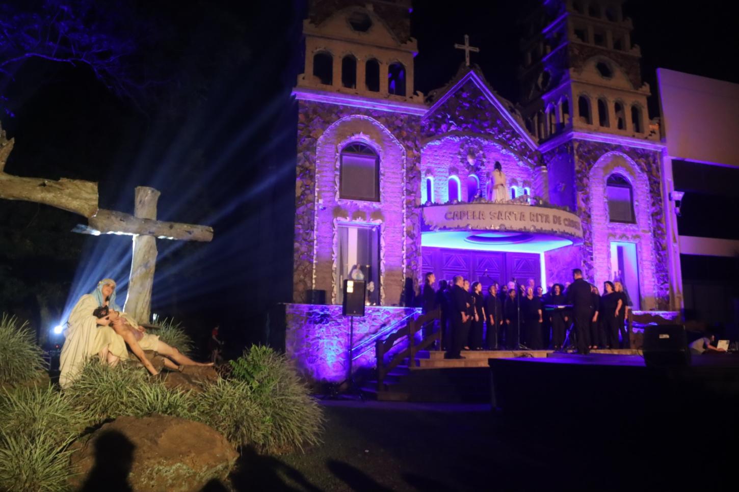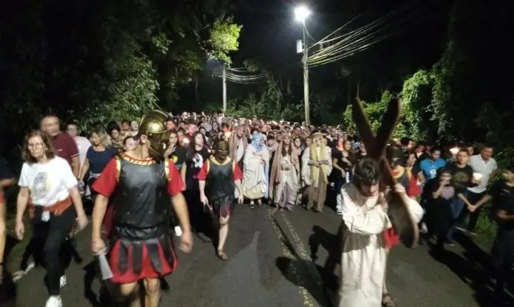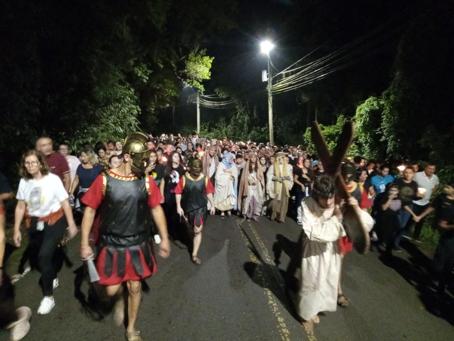 A noite sem vento, com temperatura agradável foi um convite a mais para que milhares de fiéis participassem da Via Sacra, nesta Sexta-Feira Santa (18/04), no morro da Borússia em Osório. Os cinco quilômetros até a igreja Santa Rita foram percorridos com a encenação da Paixão de Cristo, durante a passagem nas 14 estações ao longo do trajeto. Na frente da igreja, ocorreu a finalização do espetáculo “Manhã em Jerusalém”, que teve a participação do Coral Municipal de Osório. Uma multidão atenta, acompanhou a encenação dos últimos momentos de Jesus Cristo da crucificação à ressurreição.